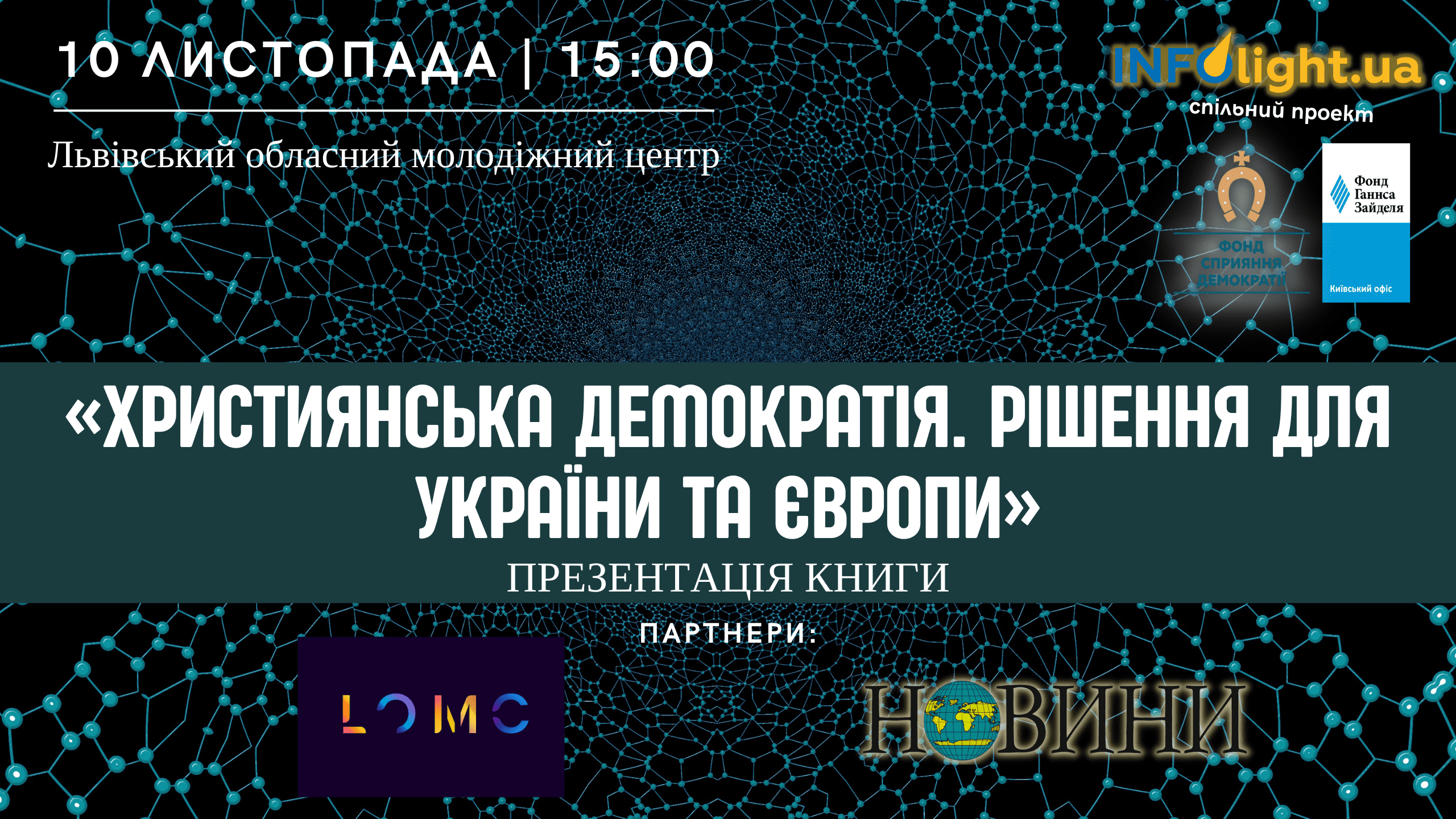 10 листопада о 15:00 в Львівському обласному молодіжному центрі відбудеться презентація книги «Християнська демократія. Рішення для України та Європи». Книгу авторства громадського активіста Юрія Міндюка, журналіста Костянтина Канішева та політолога Валерія Майданюка видано зусиллями ГО Фонд сприяння демократії.