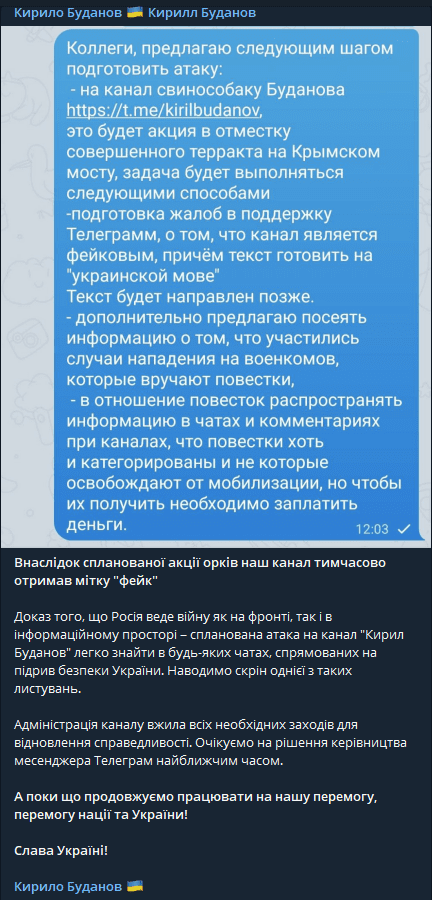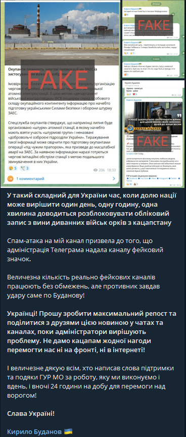 Журналісти при цьому посилалися на телеграм-канал “Кирило Буданов ?? Кирилл Буданов”, який жодного стосунку до очільника воєнної розвідки не мав, що легко перевірити на офіційних та верифікованих сторінках ГУР.