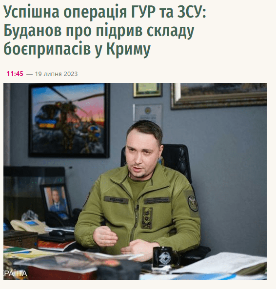 19 липня 2023 року більшість українських і навіть частина закордонних ЗМІ опублікувало інформацію про те, що нібито “Очільник Головного управління розвідки Міноборони України Кирило Буданов назвав нічний підрив складу боєприпасів у Криму успішною операцією його відомства та ЗСУ“.