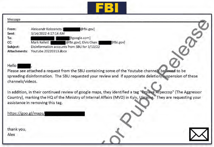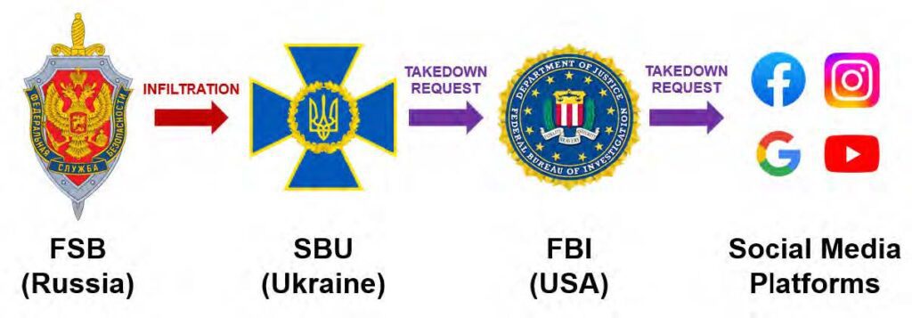 Що ще гірше, ніхто в ФБР, схоже, не висловлював занепокоєння щодо потенційного російського впливу на цензурні запити СБУ. Замість цього ФБР, схоже, схвалювало цензурні запити СБУ, регулярно перенаправляючи їх до соціальних мереж, зокрема Facebook, Instagram, YouTube і Twitter. ФБР навіть зверталося до платформ, коли вважало, що відповідь платформи була неадекватною.