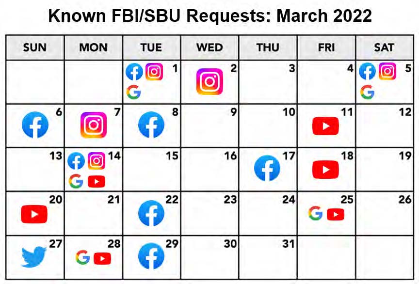 11 березня 2022 року співробітник Google надіслав ФБР електронного листа про запити, які Google отримав безпосередньо від СБУ: “Сьогодні ми отримали близько 30 [термінових запитів на розкриття інформації]… Усі вони, схоже, пов’язані з YouTube. Усі, що включають запити на видалення, ми пересилаємо команді з видалення.