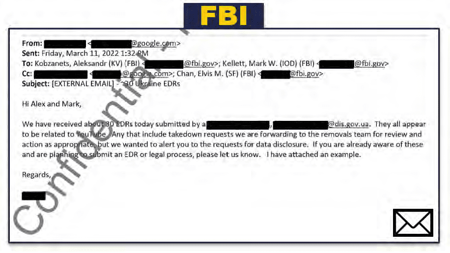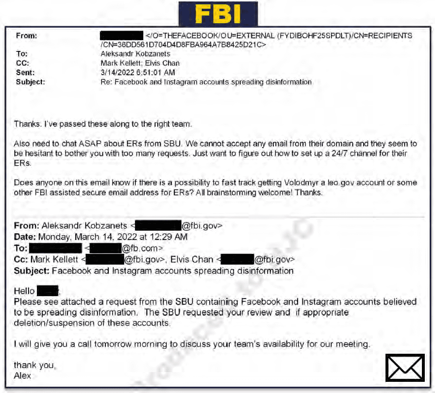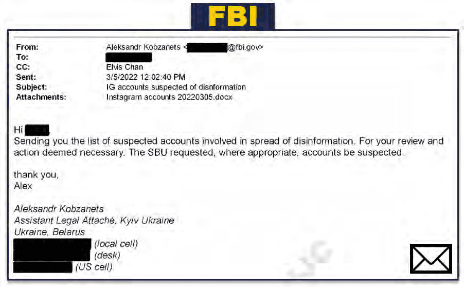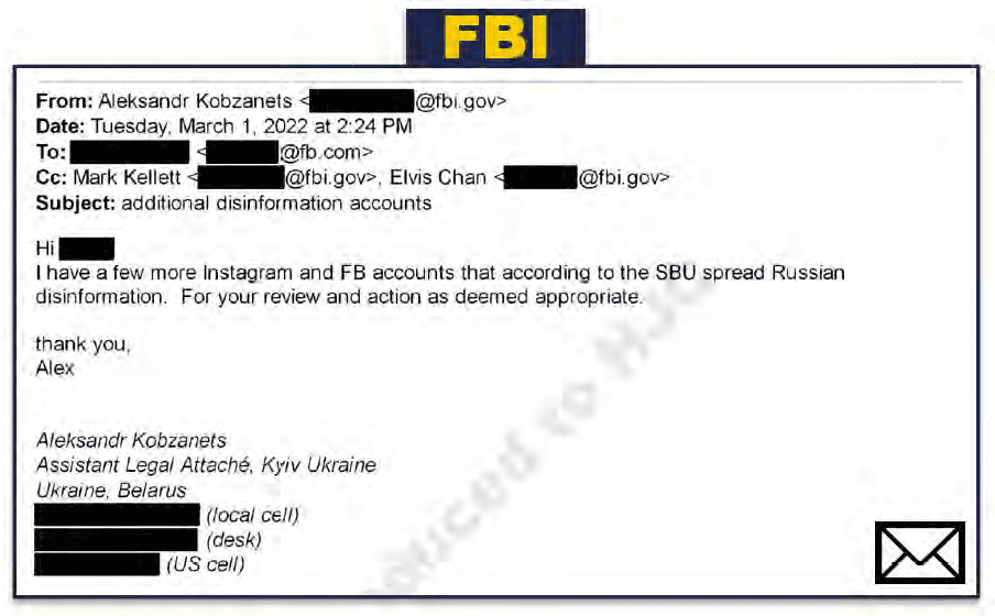 1 березня 2022 року спеціальний агент ФБР Кобзанець надіслав електронного листа співробітнику Мета з темою “додаткові дезінформаційні акаунти”.