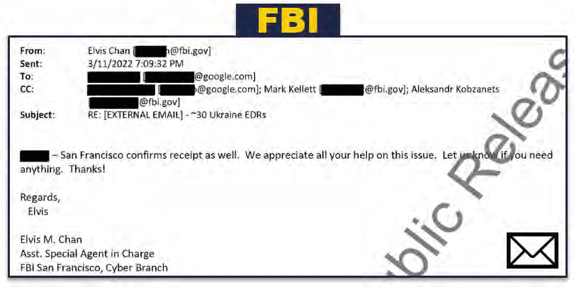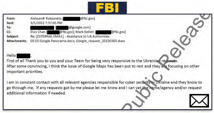 5 березня 2022 року агент ФБР Кобзанець надіслав електронного листа співробітнику Google, копіюючи агента Чана та агента Келлетта. Посилаючись на попереднє непорозуміння щодо користувацьких міток на Картах Google, агент Кобзанець подякував співробітнику та його команді “за те, що вони дуже швидко реагують на українські запити”. Потім агент Кобзанець написав, що він “постійно контактує з усіма відповідними установами, відповідальними за кібербезпеку в Україні, і вони знають, що все має проходити через мене. Якщо я отримую якісь запити, будь ласка, дайте мені знати, і я зможу перевірити ім’я/відомство та/або запросити додаткову інформацію, якщо це необхідно.