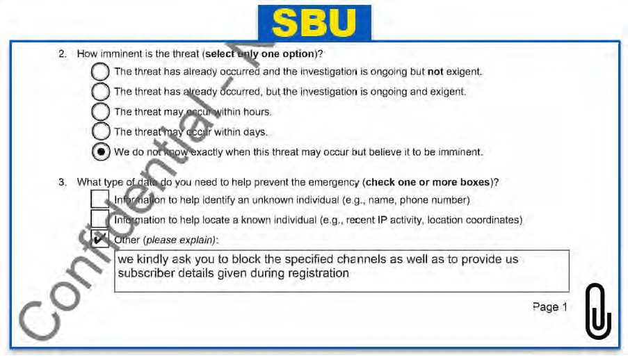 Співробітник додав форму під назвою “Запит на термінове розкриття інформації Google LLC”, подану “співробітником відділу міжнародного співробітництва” СБУ. Співробітник СБУ перерахував низку каналів YouTube і попросив Google “заблокувати вказані канали, а також надати нам дані про підписників, надані під час реєстрації”.