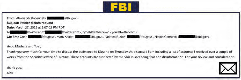 Нещодавні повідомлення показали, що ФБР також розширило можливості СБУ щодо цензури користувачів у Твіттері. 27 березня 2022 року агент Кобзанець надіслав електронного листа в Twitter, написавши: “Додаю список акаунтів, які я отримав протягом кількох тижнів від Служби безпеки України. Ці акаунти підозрюються СБУ у поширенні страху та дезінформації”. Агент Кобзанець додав документ від СБУ, подібний до тих, які він надсилав іншим соціальним мережам, зі списком акаунтів у Твіттері, які нібито “використовуються для поширення дезінформації та фейкових новин”, серед іншого.