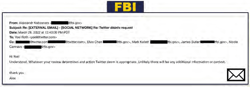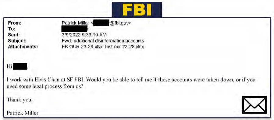 У цьому електронному листі агент Міллер, співробітник ФБР, пропонував вигадати юридичне обґрунтування для видалення позначених акаунтів, якщо Meta не виявить, що пости та коментарі порушують умови надання послуг. Цей електронний лист також демонструє, що ФБР мало переймалося як цензурою, так і заохоченням соціальних мереж задовольняти цензурні запити іноземних спецслужб.