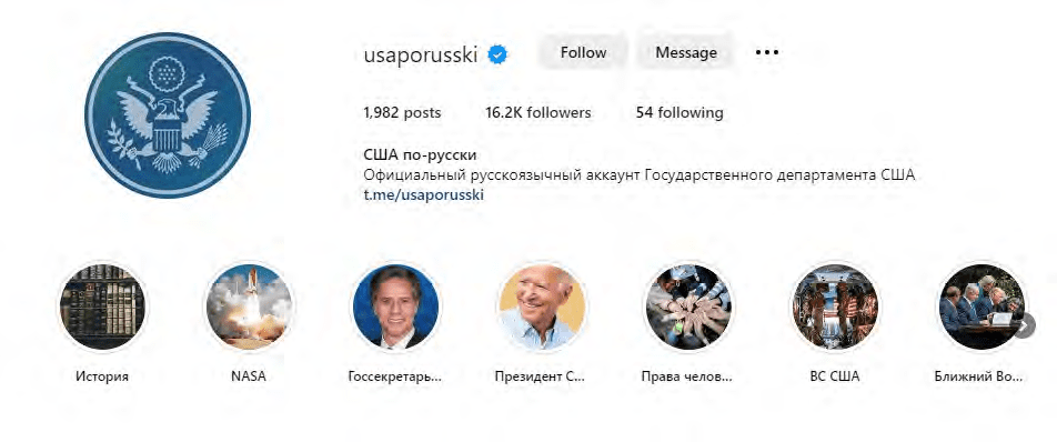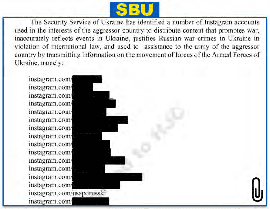 Найбільш зухвалий запит СБУ надійшов лише через день після того, як 1 березня агент Кобзанець надіслав до “Мети” дві великі таблиці. 2 березня агент Кобзанець надіслав до “Мети” електронного листа з темою “додаткові акаунти, отримані від СБУ, які, як вважають, причетні до дезінформації”. У додатку до цього листа СБУ звинуватила наданий список акаунтів в Instagram у “поширенні контенту, який пропагує війну, недостовірно відображає події в Україні, виправдовує російські воєнні злочини в Україні всупереч міжнародному праву”, серед інших речей. Неймовірно, але до цього списку потрапив акаунт @usaporusski, який є офіційним, перевіреним, російськомовним акаунтом Державного департаменту США. Ані ФБР, ані СБУ не надали пояснень щодо того, яким чином акаунт Державного департаменту США був “залучений до дезінформації”.