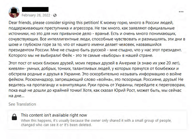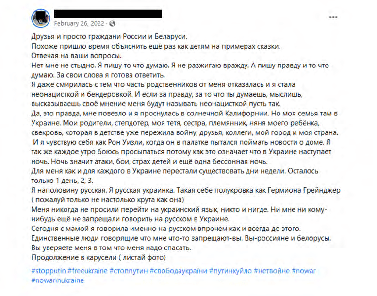 В іншому дописі російською мовою йдеться: “Мені пощастило прокинутися в сонячній Каліфорнії. Але моя сім’я там, в Україні. Мої батьки, вітчим, тітка, сестра, племінник, няня моєї дитини, свекруха, яка вже пережила війну в дитинстві, мої друзі, мої колеги, моє місто і моя країна”. Той самий американський плакат також відреагував на твердження про переслідування російської меншини в Україні, написавши: “Я наполовину росіянин. Я російський українець… Мене ніколи не просили перейти на українську мову, ніхто і ніде. Ні мені, ні будь-кому іншому не забороняли розмовляти російською в Україні”. Допис завершується низкою хештегів англійською мовою, серед яких “#stopputin”, “#freeukraine” та “#nowarinukraine”.