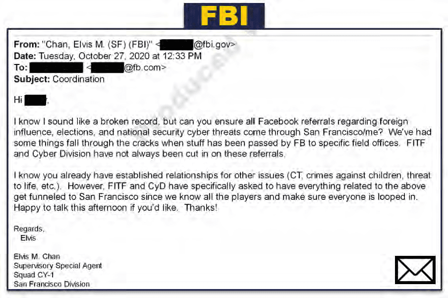 Основним зв’язком між ФБР і Кремнієвою долиною є Елвіс Чан, помічник спеціального агента, відповідальний за кібервідділ у відділенні ФБР у Сан-Франциско. Під час виборчих циклів 2020 і 2022 років агент Чан відповідав за організацію та проведення двосторонніх зустрічей між компаніями, що працюють у сфері соціальних мереж, і ЗВТ. В одному з електронних листів, надісланих співробітнику Facebook незадовго до виборів 2020 року, агент Чан попросив його “забезпечити, щоб усі звернення до Facebook щодо іноземного впливу … проходили через Сан-Франциско/мене”. Агент Чан додав, що FITF “спеціально звернулася, щоб усе, що стосується [звернень до Facebook щодо іноземного впливу, виборів та кіберзагроз національній безпеці], проходило через Сан-Франциско, оскільки ми знаємо всіх гравців і хочемо бути впевненими, що всі вони в курсі справи”.