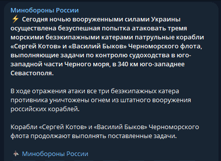 Вранці 1 серпня міноборони росії повідомило про нібито «безуспішну» атаку трьох надводних морських дронів на патрульні кораблі Чорноморського флоту «Сергей Котов» і «Василий Быков». Атака відбулася за 340 км від Севастополя, і всі дрони за інформацією ворога були нібито знищені.
