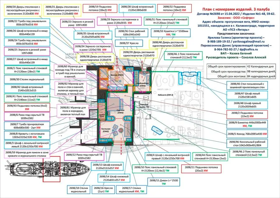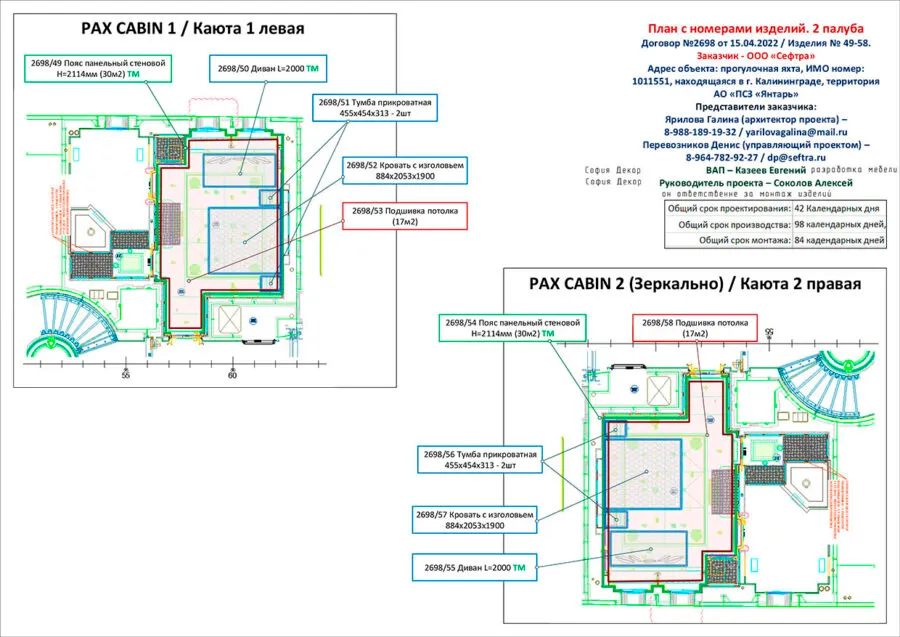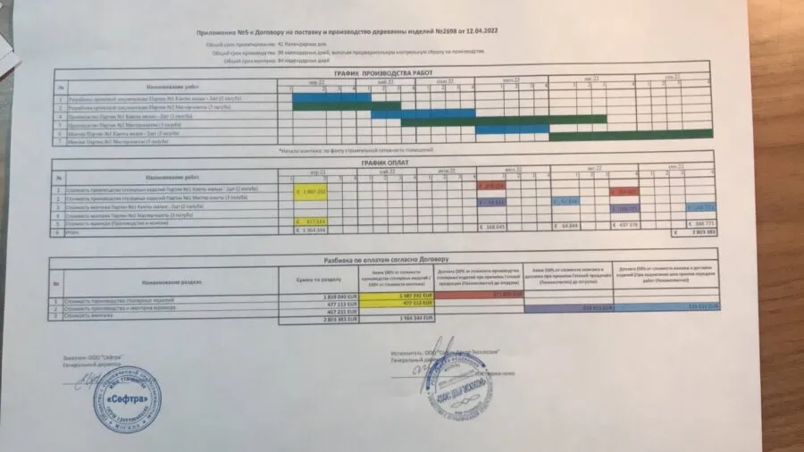 Серед інших документів, які потрапили в розпорядження журналістів, є документ під назвою Додаток №5 до Договору на поставку і виробництво дерев’яних виробів №2698 від 12.04.2022 на 1964000 євро. Ця сума в перерахунку на рублі становить близько 202 мільйонів рублів за курсом ЦБ рф. Характерно, що роботи проводили вже після початку повномасштабної війни між росією та Україною, коли сотні тисяч людей в Україні страждали від російських бомбардувань і окупації. Замовником проведення робіт є ТОВ “Сефтра”, а виконавцем ТОВ “Софія Декор Ексклюзив”, генеральний директор І.В. Черваненко. Журналісти не змогли виявити інформацію про знаходження цих підприємств та їхнього керівництва в міжнародних санкційних списках.