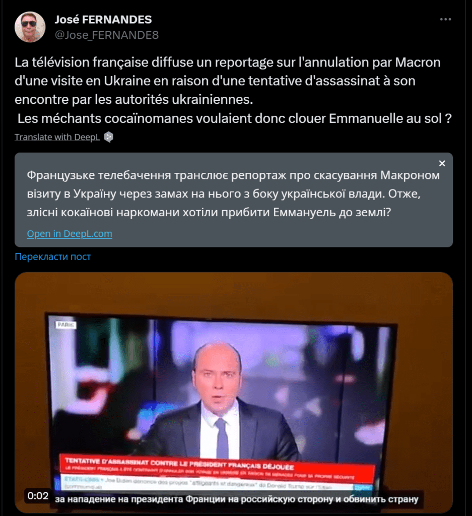 Одразу звертаємо увагу, що на відео – російські субтитри, які ширше за телевізор в кадрі. Але ж за версією російської пропаганди, відео поширив користувач мережі X з ніком @Jose_FERNANDE8. І нібито це сюжет французького телебачення, France 24.