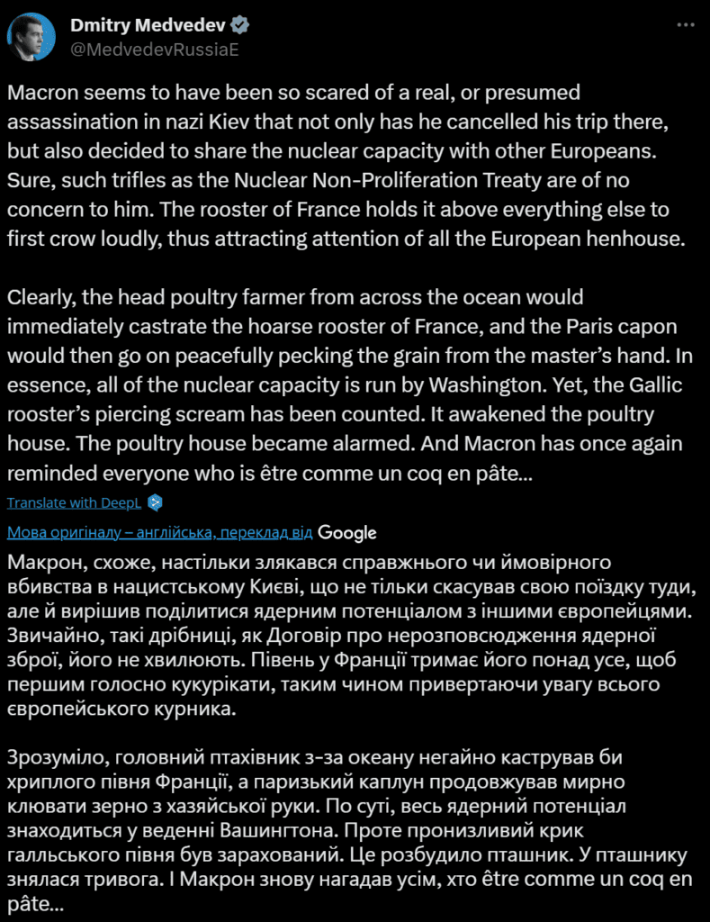 14 лютого російський сегмент інтернету почав рясніти повідомленнями про нібито спробу замаху на президента Франції Еманюеля Макрона. Його, начебто, готувався здійснити Президент України Володимир Зеленський, «операцію» курував Кирило Буданов, а запобіг замаху Валерій Залужний. Дослідницько-аналітична група InfoLight.UA за допомогою систем відстеження наративів на базі штучного інтелекту перевірила цю інформацію.