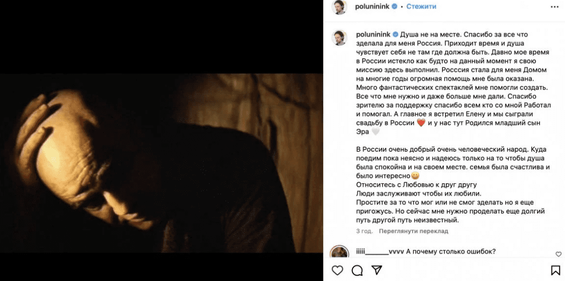 Про своє рішення виїхати Полунін повідомив у Інстаграм. Втім, його профіль закритий для широкого загалу, тому доводиться користуватись скриншотом російських медіа.