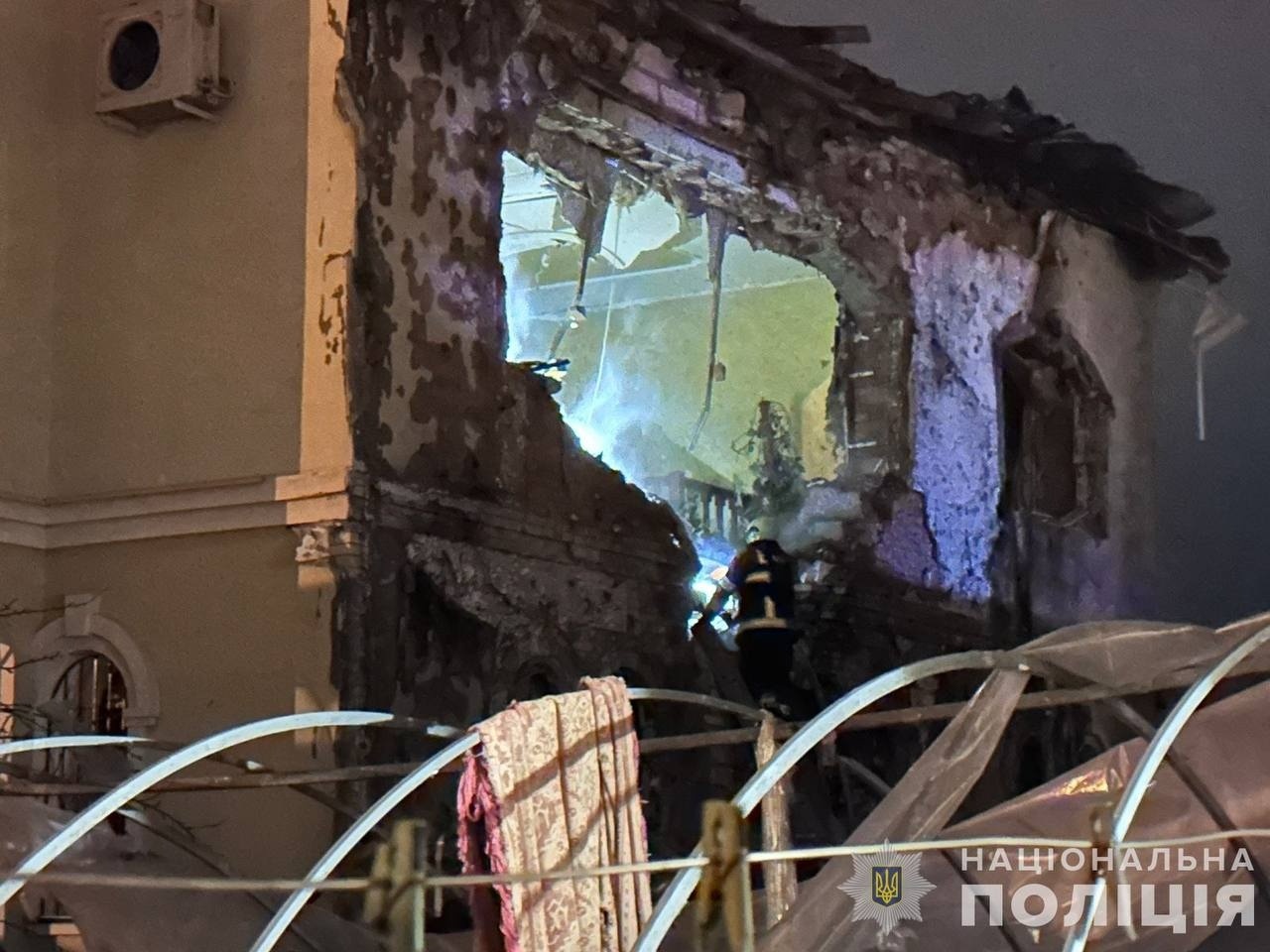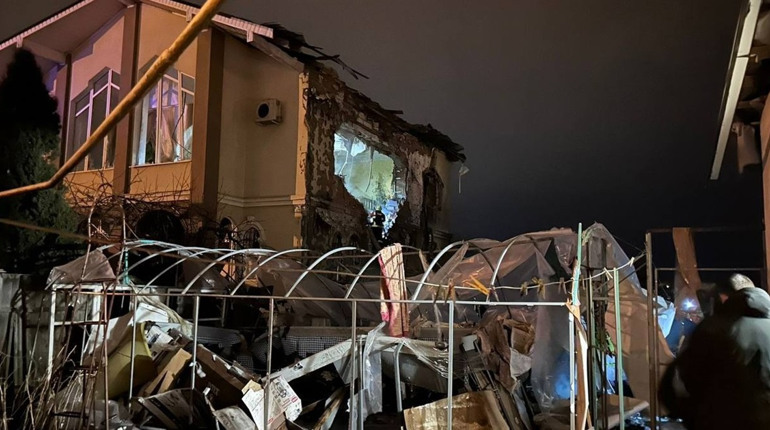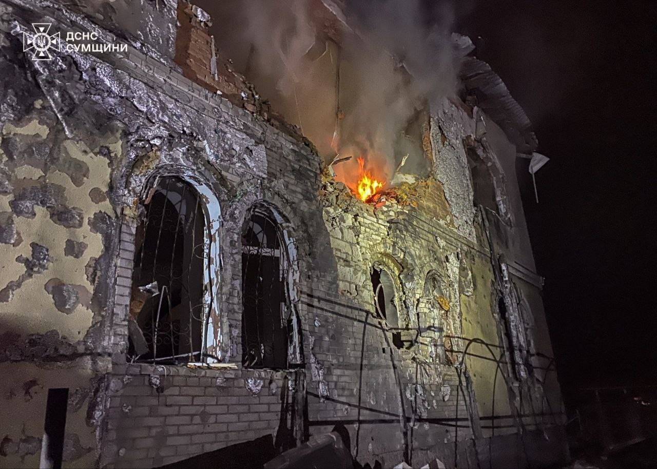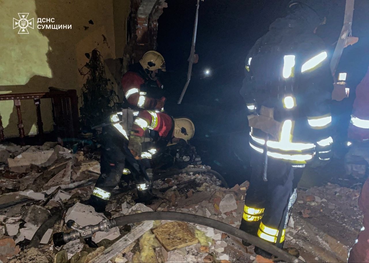 Частково зруйнований верхній поверх двоповерхового приватного житлового будинку, виникла пожежа.