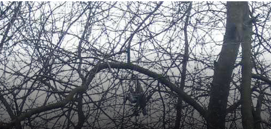 Військові не встигли прибрати дрон і він залишився висіти на дереві, наражаючи на небезпеку місцевих жителів, які живуть поруч.
