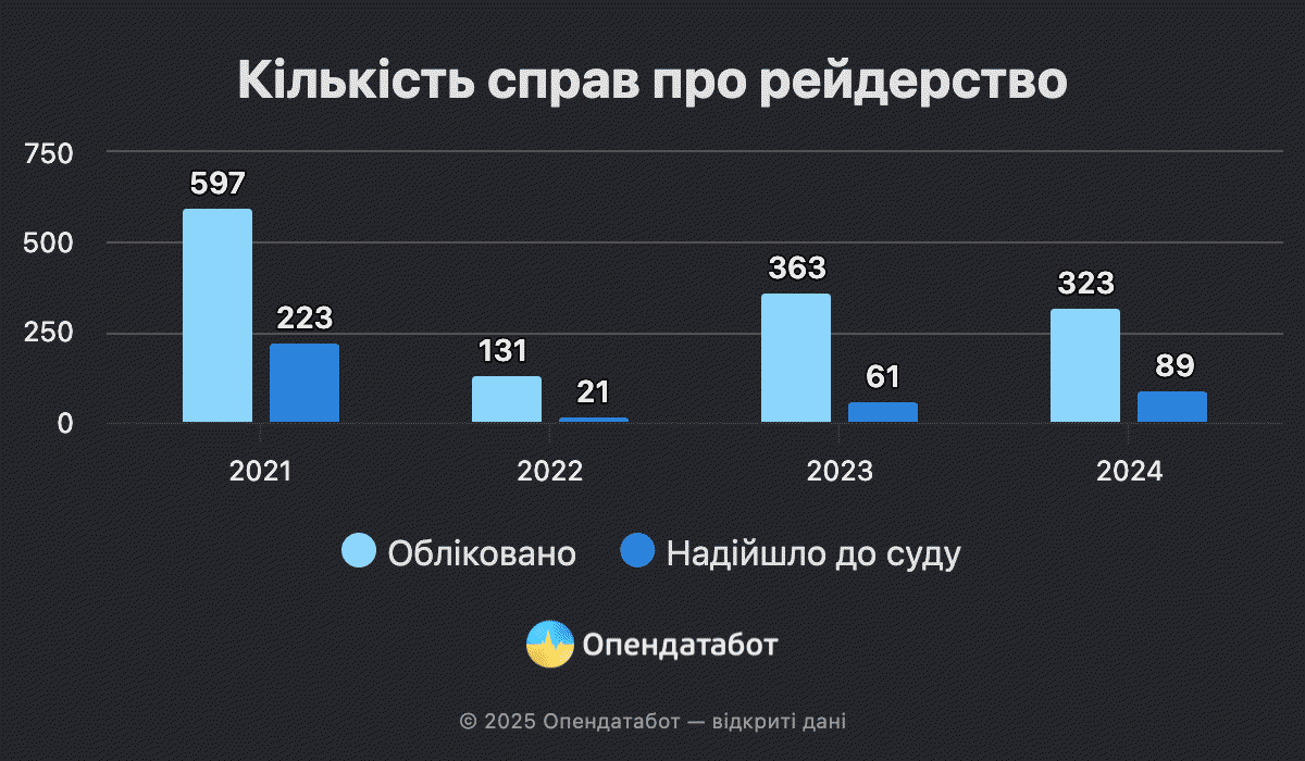 323 справи про рейдерство зафіксували торік — на 11% менше, ніж у 2023 році. Також це у 1,8 раза менше, ніж у 2021 році.