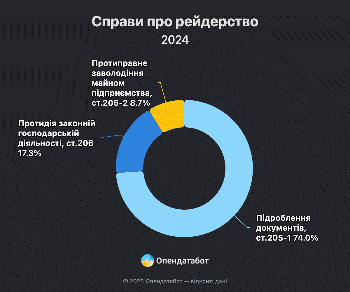 74% від усіх кримінальних справ про рейдерство стосуються підробки документів (ст. 205-1 ККУ). Ще у 17% справи відкривали через протидію законній господарській діяльності (206 ККУ), а решта випадків стосувались протиправного заволодіння майном (ст. 206-2 ККУ).