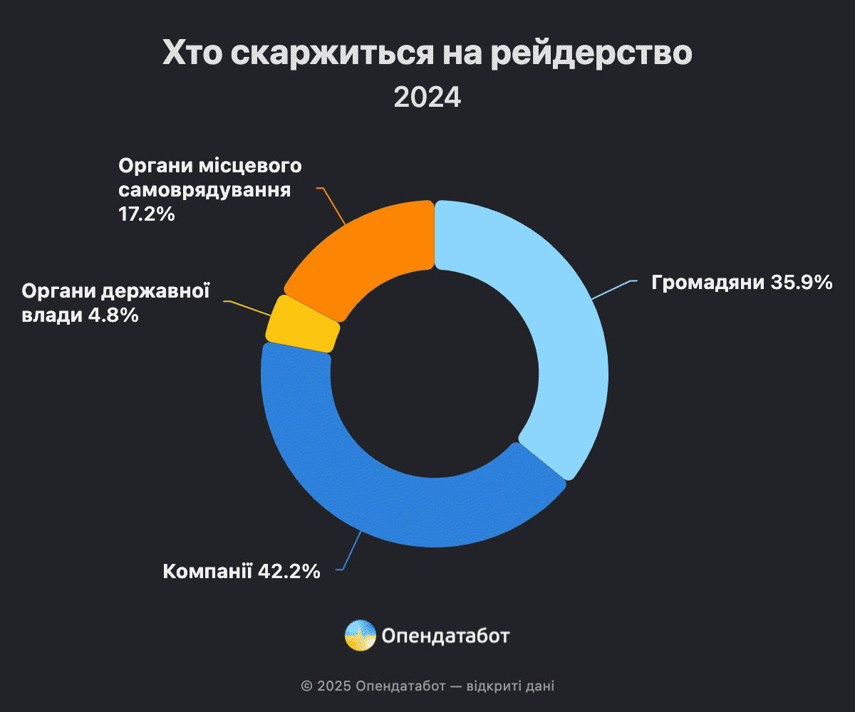 В останні два роки кількість скарг від українців знизилася до 36%, водночас звернень від бізнесу побільшало до 42%. Також до 17% зросла частка скарг від органів місцевого самоврядування (сільські, міські, районні та інші ради). До порівняння, з 2020 по 2023 роки, в середньому, цей показник складав 7%.