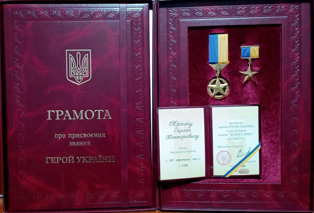 Черкащанину Сергію Юрчику посмертно присвоїли звання Героя України з удостоєнням ордена “Золота Зірка”. Орден дружині полеглого захисника Людмилі президент вручив 31 січня 2025 року.