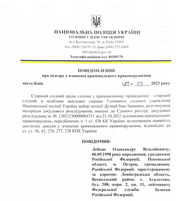 За інформацією з відкритих джерел та підозри зрозуміло, що обвинувачений – 24-річний росіянин, лейтенант ФСБ Олександр Лебідь. Підозру йому оголосили 23 серпня 2023 року.