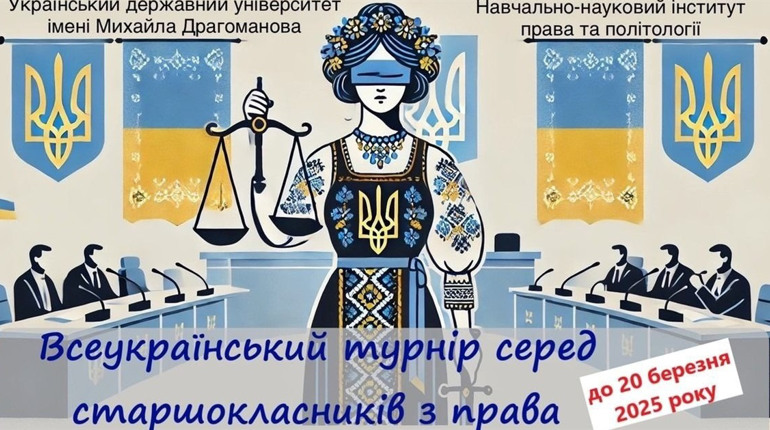 Навчально-науковий інститут права та політології Українського державного університету ім. Михайла Драгоманова запрошує старшокласників взяти участь у Всеукраїнському турнірі з права. Захід відбудеться у березні-квітні 2025 року.