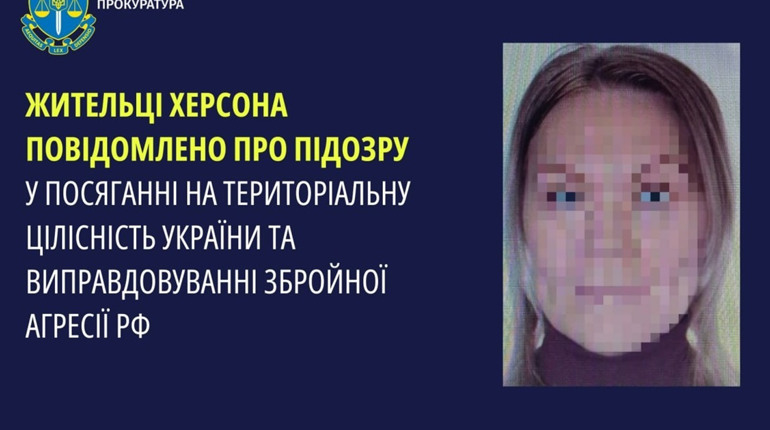 За процесуального керівництва Херсонської обласної прокуратури жінці заочно повідомили про підозру у посяганні на територіальну цілісність і недоторканність України та виправдовуванні збройної агресії рф (ч. 2 ст. 110, ч. 2 ст. 28, ч. 2 ст. 436-2 КК України).