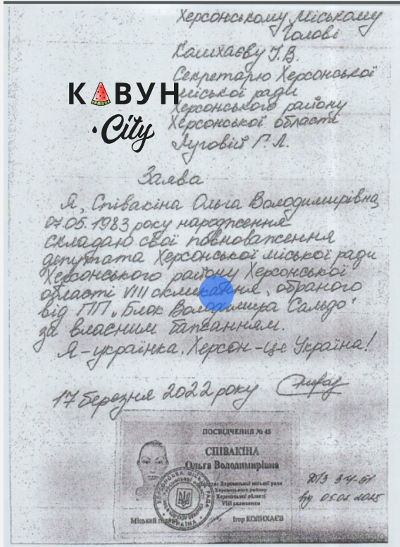 Журналісти Кавун.City запитали коментаря щодо ситуації навколо Співакіної у Херсонській МВА. Нам надали зокрема і копію заяви Співакіної від 17 березня 2022 року про складання повноважень, про яку вона пише.