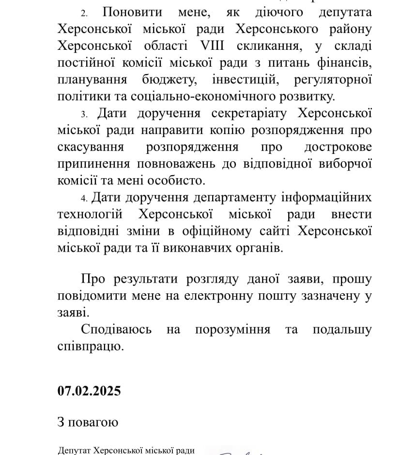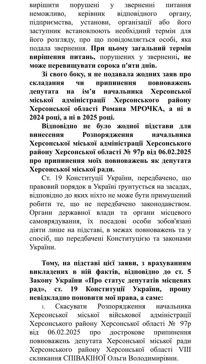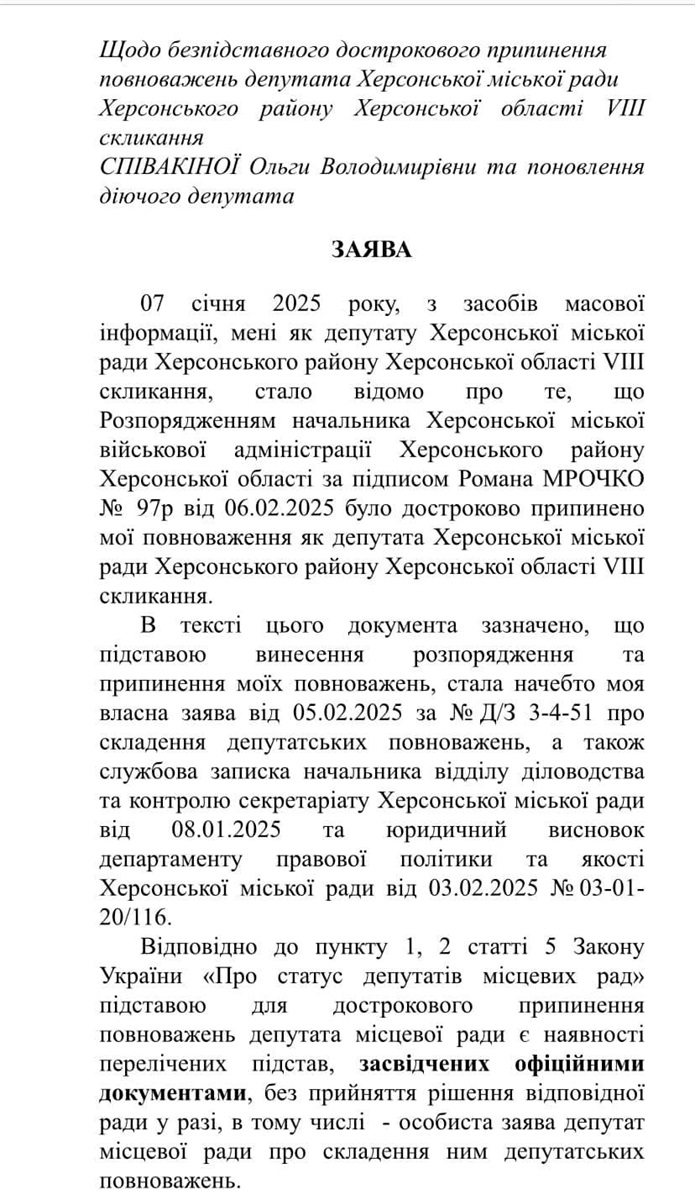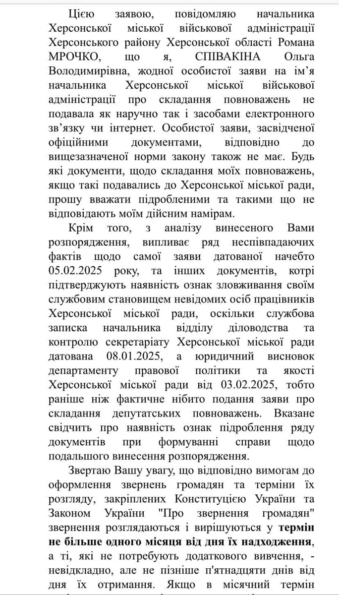 Заступник міського голови Дмитро Шпорт у своєму коментарі нам зазначив: «Станом на 06.02.2025 року — дату розпорядження «Про дострокове припинення повноважень депутата Херсонської міської ради Херсонського району Херсонської області VIII скликання Сіпвакіної Ольги Володимирівни» — заяв та/або інших повідомлень від Ольги Співакіної щодо нерозгляду її заяви про складання повноважень не надходило».