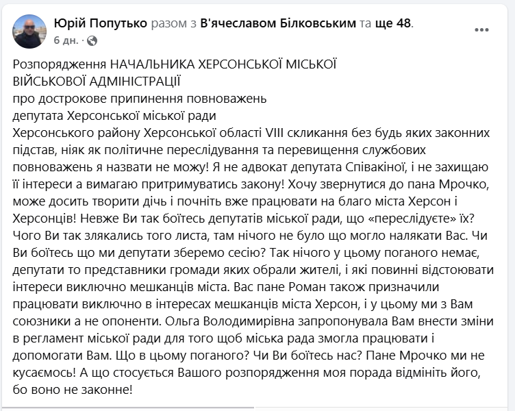 Допис з акаунту, який належить Юрію Попутьку, залишаємо