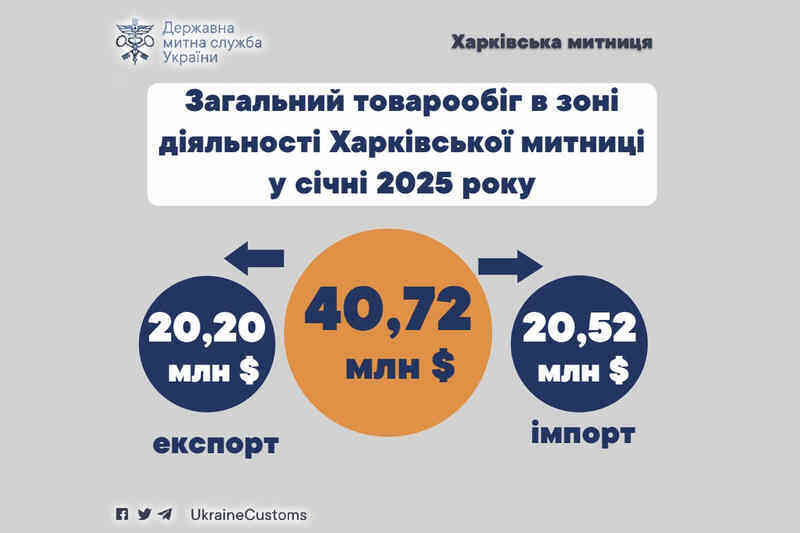 Протягом січня 2025 року представники бізнесу здійснили експортно-імпортні операції в зоні діяльності Харківської митниці на 40,72 мільйонів доларів США.
