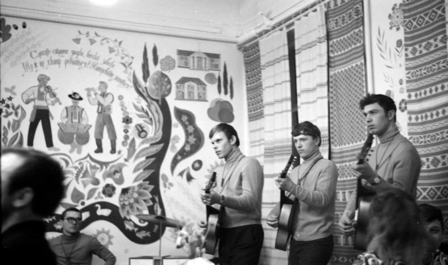 “Оскільки біля нашого села протікає річка Супій, там була намальована така блакитна стрічка і написано: “Супій”. По тій річці пливли намальовані рибки і качки. Вгорі намалювали троїстих музик,” — каже Віктор Трохимович. А ще — на стіні було панно із козаком Мамаєм та народними мотивами. На стінах висіли фіранки з українським орнаментом.
