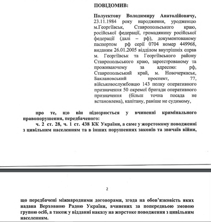 40-річний капітан Владімір Полуектов зі Ставропольського краю РФ — російський військовослужбовець 143 полку оперативного призначення. Його обвинувачують у жорстокому поводженні з цивільними та відданні наказу на це – слідство каже, що Полуектов у змові з іншими утримував та катував людей у ізоляторі тимчасового тримання під час окупації Херсона.