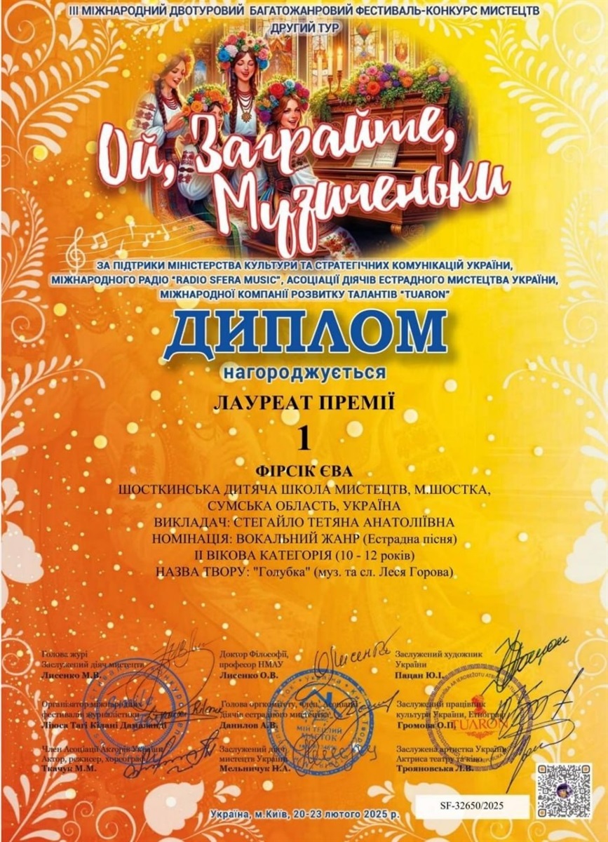Шосткинська талановита вокалістка Єва Фірсік, учениця Шосткинської дитячої школи мистецтв, здобула блискучі перемоги на двох престижних міжнародних конкурсах. Її неймовірний талант та наполеглива праця принесли їй заслужені нагороди.