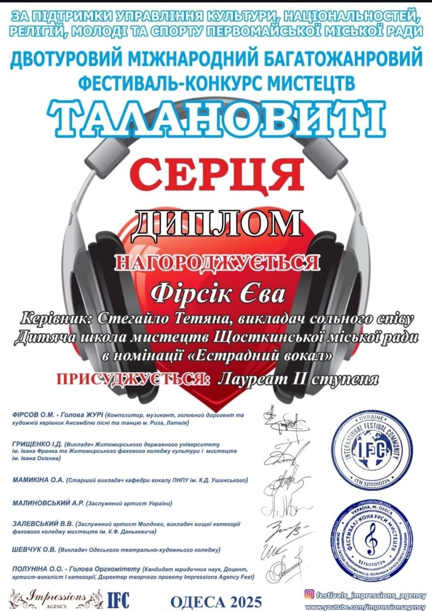Одночасно, на Міжнародному конкурсі “Талановиті серця” в Одесі, Єва отримала диплом II ступеня у номінації “Естрадний вокал”, середня вікова категорія. Її виконання вразило журі своєю емоційністю та професіоналізмом.
