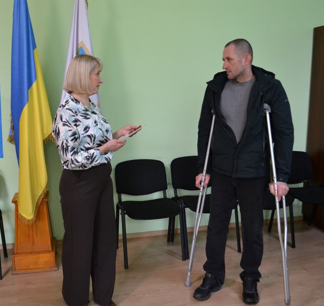 Нагороду, мешканцю Шосткинської громади, Руслану Олексійовичу Ляху – солдату військової частини А2167, вручила тимчасово виконуюча обов’язки голови Шосткинської районної державної адміністрації – начальника районної військової адміністрації Оксана Тарасюк.