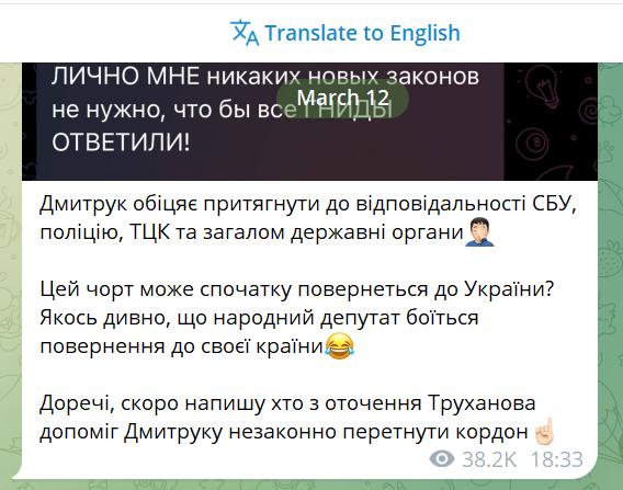 «До речі, скоро напишу хто з оточення Труханова допоміг Дмитруку незаконно перетнути кордон».