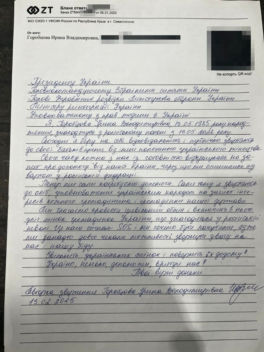 У лютому цього року Ірина написала листа зі зверненням до української влади, де благає повернути додому всіх цивільних українок, яких утримує Росія. Цим листом з нами поділилася Катерина Золотухина.