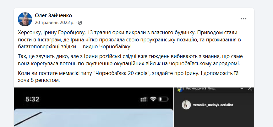 Кавун.City зауважує: про те, що вікна Ірини виходять на чорнобаївський аеродром, написав помічник народної депутатки від «Слуги народу» Вікторії Вагнєр Олег Зайченко у соцмережі у травні 2022 року. Ми пам’ятаємо цей пост, адже самі перебували в окупації і ледь не стали жертвами росіян, які приїздили за нами у той самий день, що і за Іриною, — 13 травня 2022 року. Нам дивом вдалось врятуватись. Тому слідкували за перебігом подій. Оціночне судження: навіщо потрібно було писати цю деталь про вікна на Чорнобаївку, аби «затвердити» росіянам вигаданий привід для звинувачення, невідомо. Кінець оціночного судження.