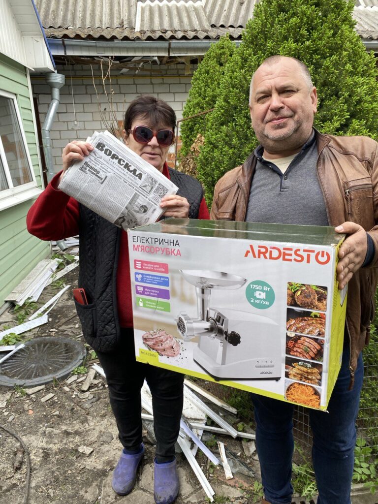 Це фото було зроблено у сумні для родини Гуцалів дні: у березні 2024 року КАБом було зруйновано їхню домівку. Трохи розрадив господиню приз від газети “Ворскла”. Пані Ольга завжди була активною передплатницею й взяла участь у розіграші призів від нашої газети. І от, пощастило виграти кухонний комбайн. Сподіваємося, він став у нагоді і допомагає зараз готувати різні смаколики. А нам стало у нагоді це фото, бо Ольга Іванівна категорично відмовляється фотографуватися. Виняток зробила лише тоді, хоча й сховала заплакані очі за окулярами.