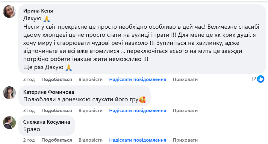 “Звісно, підтримують – якщо людям подобається, вони дякують і так. Особливо зворушливими є зустрічі з військовими. Коли граю українські мелодії, часто підходять бійці, дякують. Кажуть, що це дуже на часі, підтримує бойовий дух”, – розповідає музикант.