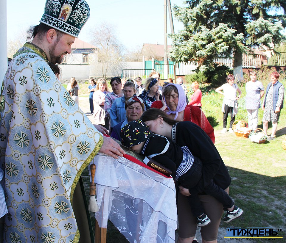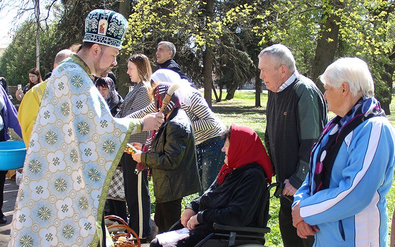 Понад шістдесят прихожан розділили радість Великодня. Коли священник підходив до людей, ті радісно підставляли себе під краплі води, що щедро розбризкувалися.