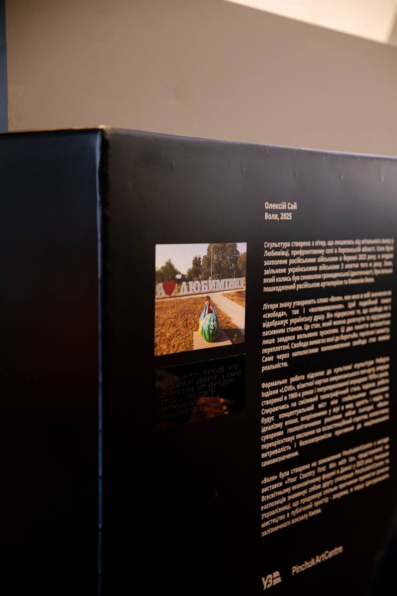 Нову мистецьку інсталяцію презентували Укрзалізниця спільно з PinchukArtCentre. Автор — відомий український художник Олексій Сай. Скульптура складається з букв, які залишились від вітального знака селища Любимівка. Знак, який колись був символом громадянської ідентичності, був сильно пошкоджений російською артилерією та ближнім боєм. Село українська армія звільнила вже восени 2022 року — 3 жовтня. Зауважимо, це Любимівка Бериславського району. Любимівка Каховського району — досі в окупації.