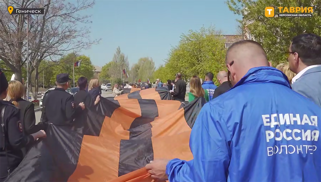 Одним із символічних елементів підготовки стало розгортання 84-метрової «георгіївської стрічки» — пропагандистського символу російської військової експансії. Акція стартувала в Генічеську, а далі стрічку провезуть через усі 14 окупованих округів Херсонщини.