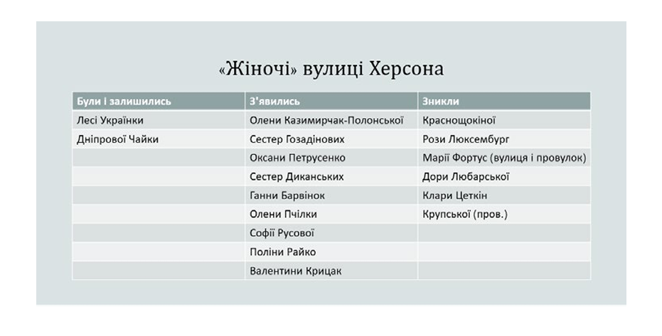 До речі, «жіночих» найменувань у Херсоні стало більше: було вісім — стало одинадцять. Так, в загльній кількості це дуже мало, але істотний крок вперед.