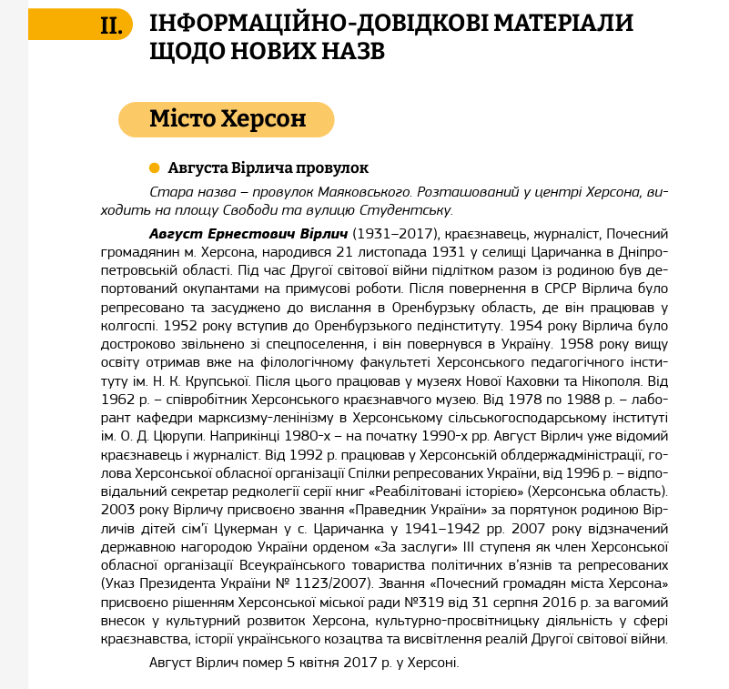 Також не можемо не зазначити того факту, що в Херсоні провулок Маяковського отримав ім’я Августа Вірлича: видатного херсонського громадського діяча, краєзнавця, журналіста, дослідника комуністичних репресій, реалій Другої світової війни, Голодомору, одного з засновників товариства «Меморіал імені Василя Стуса» на Херсонщині та обласного осередку партії «Народний рух України», в’язня концтаборів нацистів та політичного в’язня радянського режиму, дідуся головної редакторки Кавун.City Євгенії Вірлич.