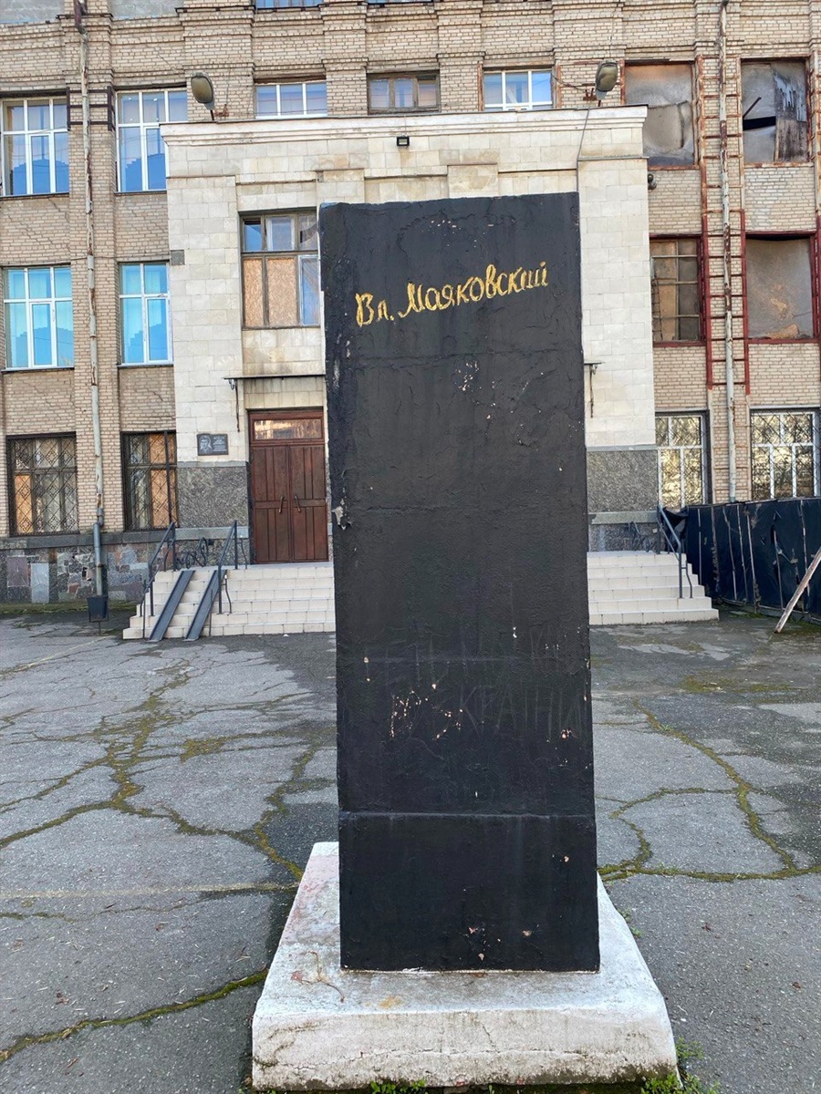 А ось так виглядає колишнє погруддя Владіміру Маяковському, яке ще донещодавна було в Херсоні (його знесли у 2022 році) у дворі херсонського ліцею, понівеченого російськими обстрілами