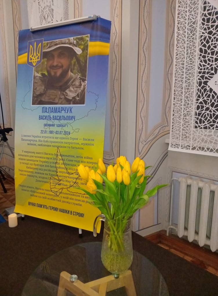 Василь Паламарчук — командир роти вогневої підтримки 206 батальйону територіальної оборони ЗСУ загинув 3 липня на Торецькому напрямку під час виконання бойового завдання. Василь Паламарчук був родом з Херсонщини. До війни Василь працював адвокатом. Його військовий шлях почався ще у 2014 — 2015 роках, коли він брав участь в АТО у складі 28-ї окремої механізованої бригади. З початком повномасштабного вторгнення Росії 24 лютого 2022 року Василь Паламарчук, батько трьох дітей, одразу вступив до лав територіальної оборони та брав участь у звільненні Бучі, в той час, як його родина рятувалася від окупації з Олешок на Херсонщині. Василь Паламарчук встиг реалізувати себе зокрема і як письменник: у книзі «Військовий непотріб» він розповів про будні військових.
