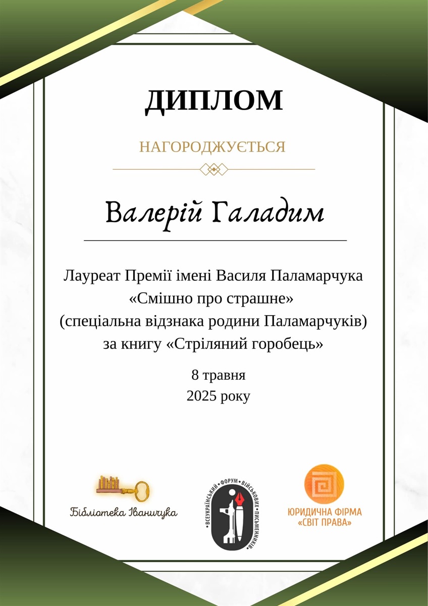 Спеціальну відзнаку сім’ї Паламарчуків отримала дебютна книга учасника АТО, військовослужбовця Валерія Галадима «Стріляний горобець», який зумів виїхатиз окупації. Як розповів автор, саме Василь Паламарчук надихнув його до написання книги. «Коли не стало Василя Паламарчука я наче втратив сина. Дуже боляче. Вдячний вам, що зберігаєте про нього пам’ять», – сказав Валерій Галадим. Вручила відзнаку дружина Василя Паламарчука Наталія.