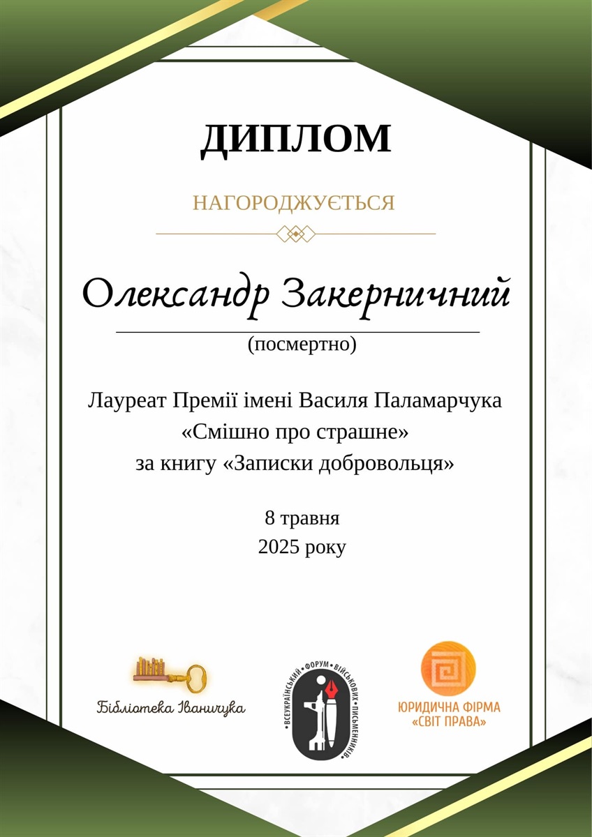 Посмертно премію присудили інженеру, фотографу, художнику, письменнику і військовослужбовцю 68 окремої єгерської бригади ім. Олекси Довбуша Олександру Закерничному за книгу «Записки добровольця». Загинув Олександр під Бахмутом у серпні 2023 року.